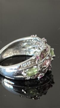 9ct White Gold ring set with green & pink gemstones & chip diamonds Weight 5g