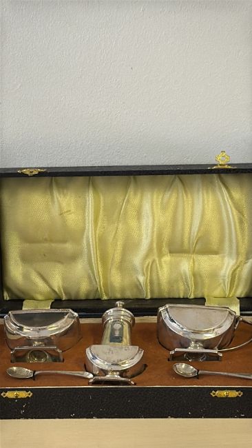 Art deco silver cruet set in plush fitted case Makers E.W.H Birmingham hallmark date letter X