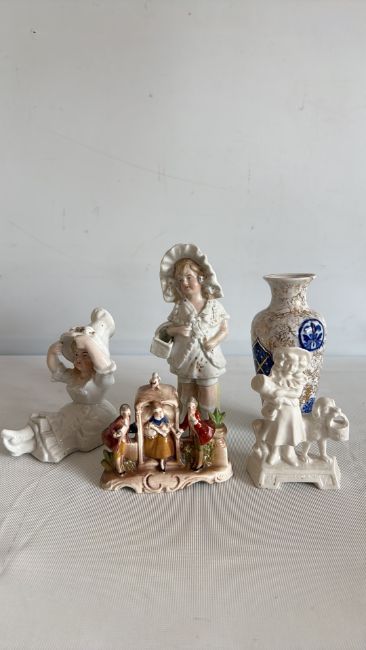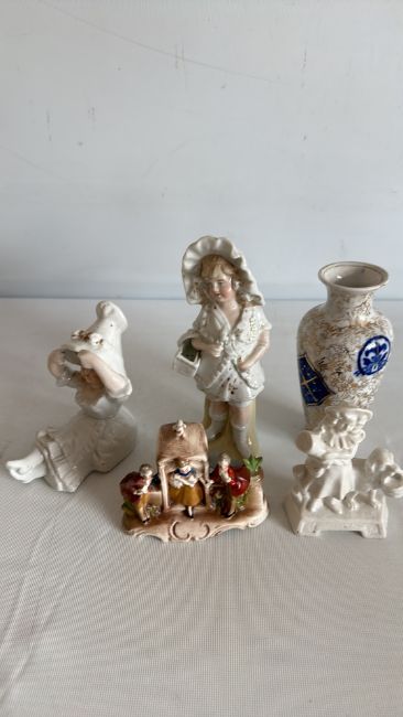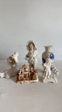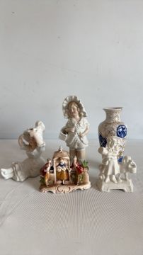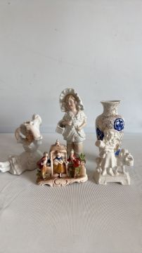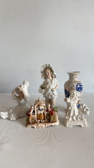 Group of decorative ceramic figurines and vase