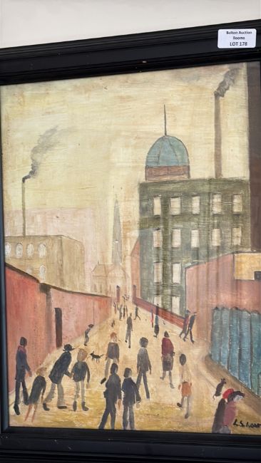After L S Lowry oil on board depicting mill-town street with smoking chimneys and strolling figures, signed and dated lower right “L. S. Lowry 67”. (35cm x 43cm including frame)Laurence Stephen Lowry (British, 1887–1976) is celebrated for distinctive industrial cityscapes populated by ‘matchstick’ figures; his works are held in major public collections worldwide.