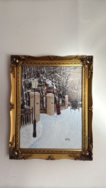 Barry Hilton framed oil on canvas depicting a snow-covered street with lamppost, solitary red-clad figure and horse-drawn carriage before gated house, signed “Hilton” lower right. (38.5cm x 49cm including frame)
