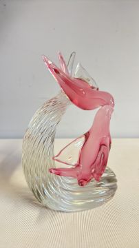 Murano sommerso glass sculpture by Vetreria Artistica Oball, two stylised pink fish poised on a clear twisted wave base.