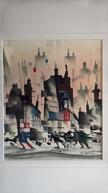 S.F. Howells mixed-media cityscape, semi-abstract rooftops with figures, balloons and pram, gouache and ink on paper, signed lower right, framed and glazed.S.F. Howells (British, 20th century) exhibited widely from the 1960s, noted for stylised urban scenes held in Welsh public collections.