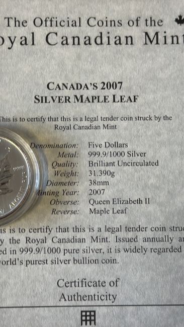 2007 Canadian $5 Silver Maple Leaf bullion coin, 1 oz fine silver