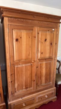 Solid pine two-door wardrobe, moulded cornice above panelled doors, fitted interior hanging rail, over twin lower drawers and shaped plinth base.