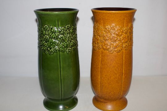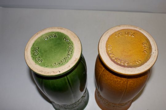 Pair of Bay Keramik West German ceramic floor vases, model 750/35, baluster form with flared rims and relief clover bands, glazed respectively in glossy emerald and speckled ochre.Founded in Ransbach-Baumbach in 1933, Bay Keramik became a leading producer of post-war West German art pottery, renowned for its innovative forms and rich glazes that epitomised the ‘Fat Lava’ aesthetic popular throughout the 1950s-1970s collector market.