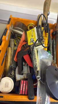 Box of assorted hand tools and accessories