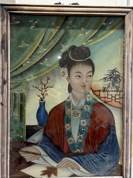Late 19th early 20th century Chinese reverse glass portrait with original oriental metal hanger. 55 cm x 40 cm size including frame