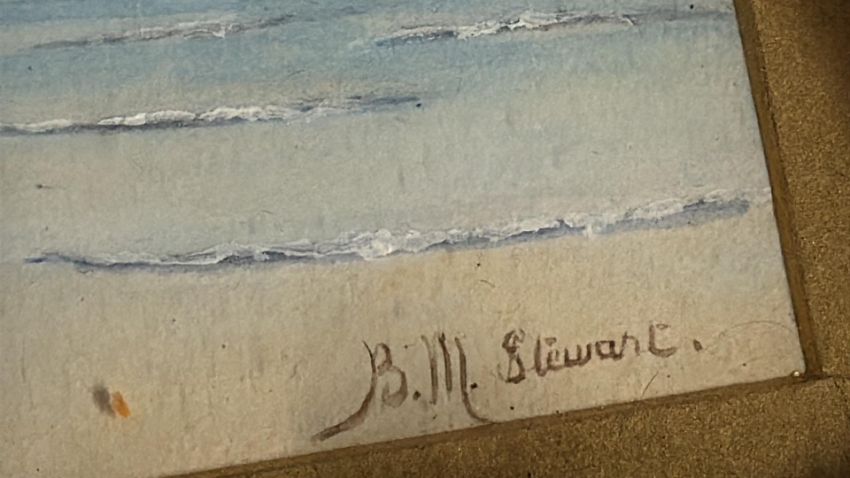 Shell-framed coastal watercolour signed B. M. Stewart