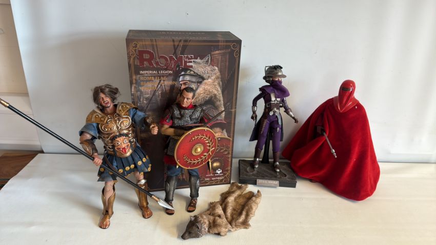 Group of four collectible action figures including Rome Imperial Legion and Star Wars figures