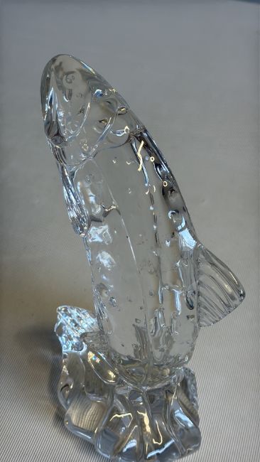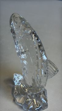 Etched-signed moulded glass leaping salmon figure