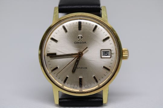 1974 Omega Genève wristwatch with date app at 3 o clock, manual wind movement. Currently ticking, time sets as it should, date app function currently working. Age related ware visible scratches to the glass original crown, replacement strap.