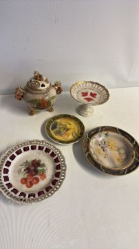 Set of 4 decorative ceramics including incense burner and commemorative pedestal dish