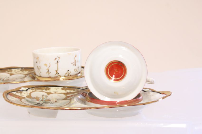Set of Two Japanese Kutani-Style Porcelain Tea Cups and Saucers