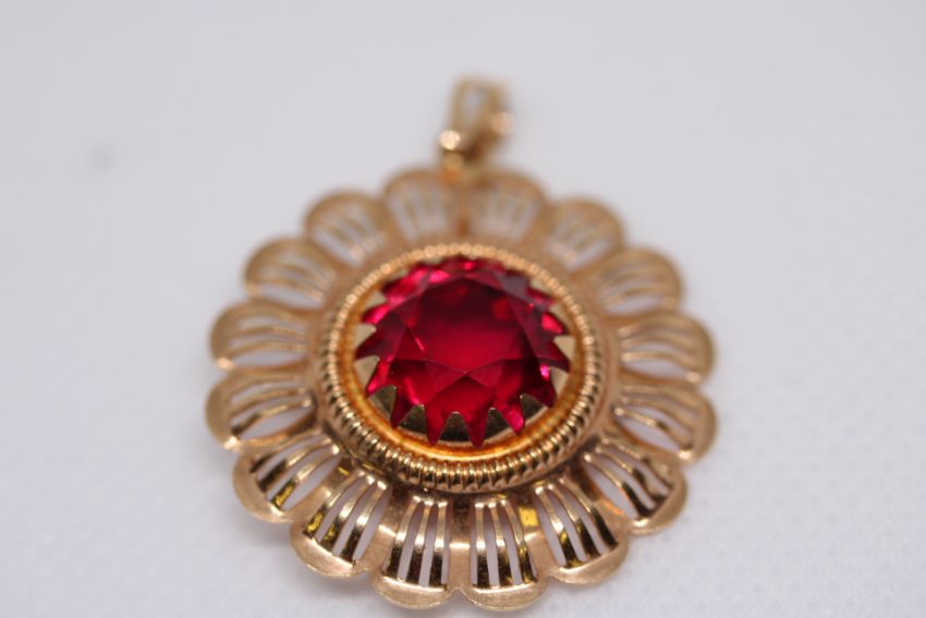 18ct Gold pendant set with red gem stone Weight 5.2g