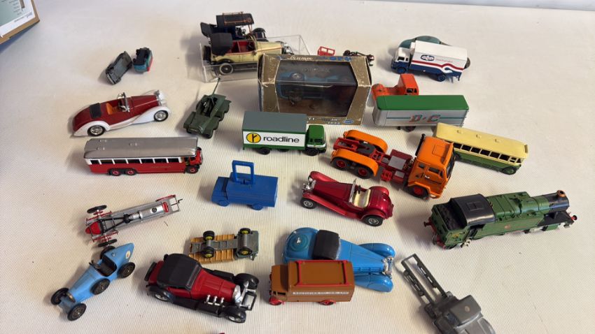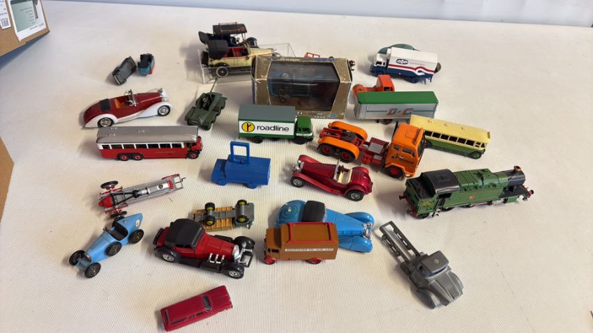 Group of die-cast model vehicles including cars, lorries, buses and locomotive
