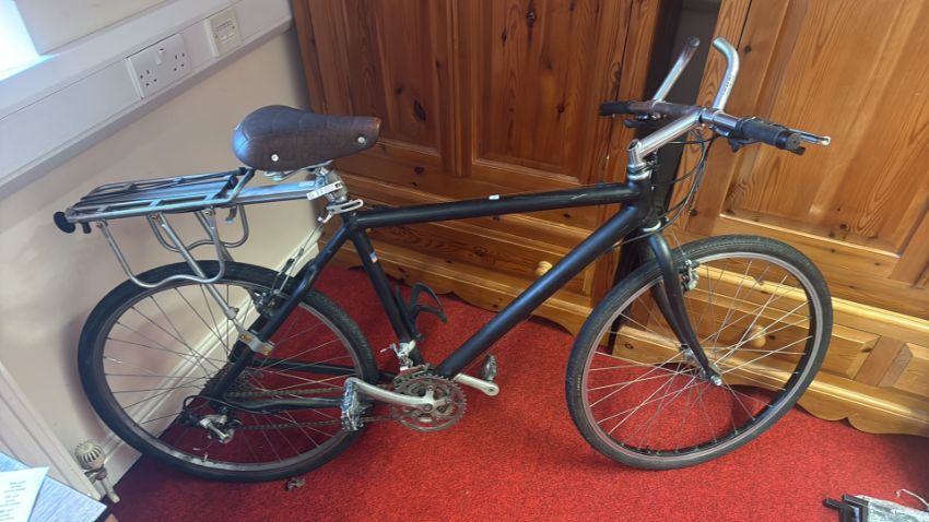 One Selle Royal saddle-fitted road bicycle with flat handlebars, alloy wheels, derailleur gears, and rear cargo rack, finished in black with calliper brakes and bottle cage.
