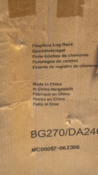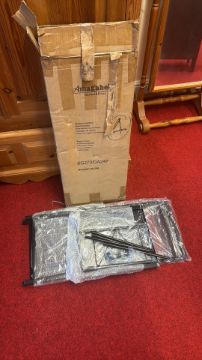 A boxed Amagabel Garden & Home fireplace log rack, in black metal, supplied disassembled with associated frame pieces and fittings; model BG270/DA246, made in China.