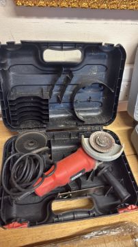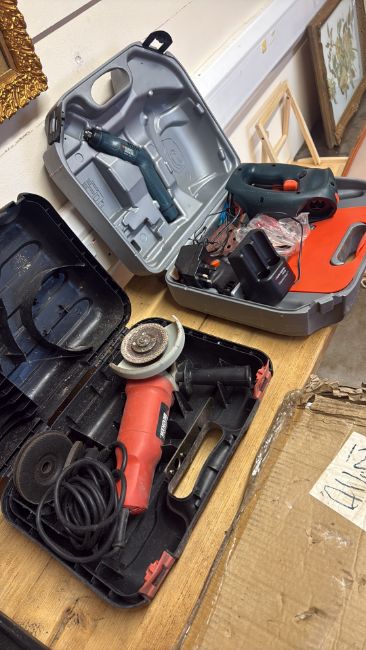 Group of Black+Decker cordless screwdriver and jigsaw, with Decraft angle grinder in cases