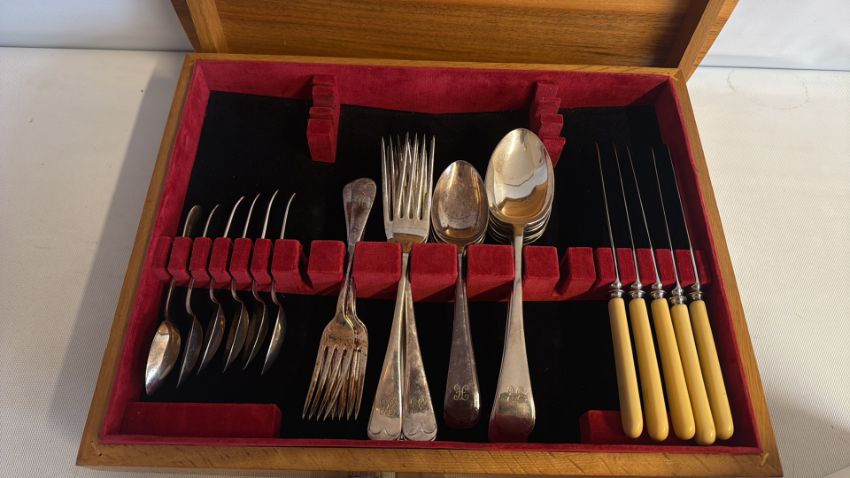 Group of assorted cutlery with fitted wooden canteen and box of loose flatware
