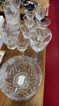 Collection of cut glass tablewares comprising a large circular bowl, two tall tumblers, two small tumblers, three coupe glasses, a single wine glass and a large stemmed bowl, with mixed geometric and foliate wheel-cut decoration.