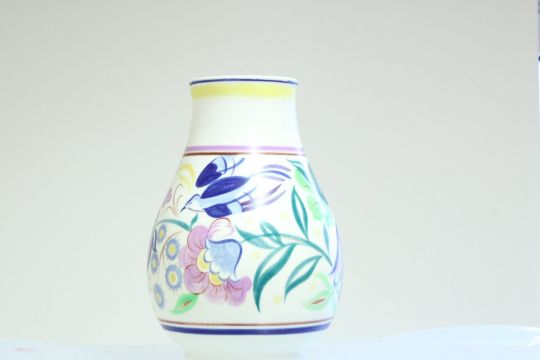 A Poole Pottery baluster vase, of ovoid form with waisted neck, decorated in polychrome with stylised flowers and foliage, with banded rim and foot; printed Poole England seal mark beneath. Height 26 cm
