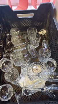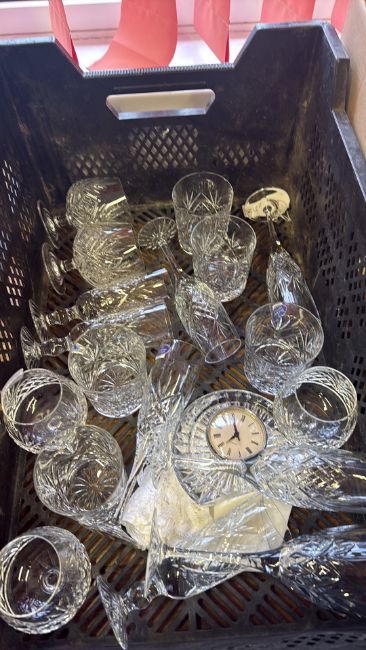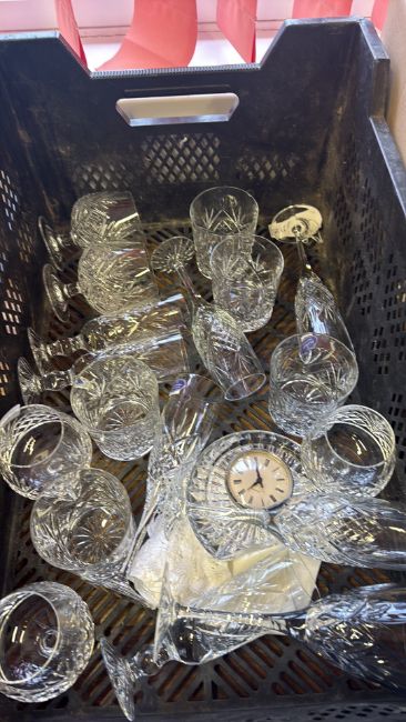 Group of cut glass stemware, tumblers and a cut glass mantel clock