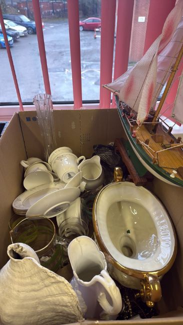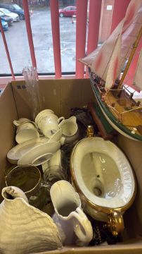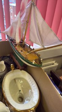 Mixed decorative ceramics, glassware and a model sailing boat