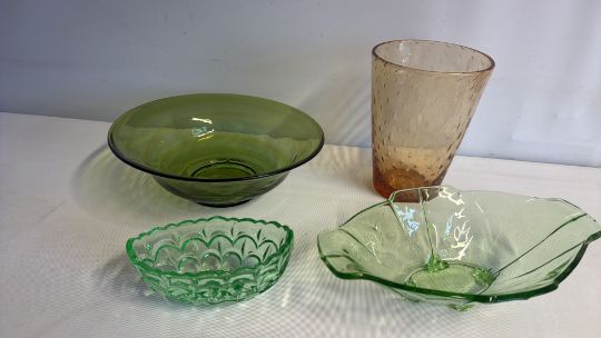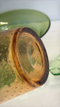 Group of coloured glass bowls and amber bubble-glass tumbler