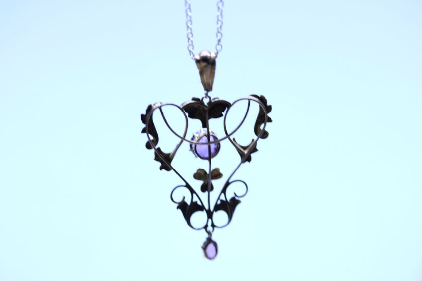 9ct Gold art nouveau pendant on 9ct gold chain, pendant set with amethyst Weight 3.1g