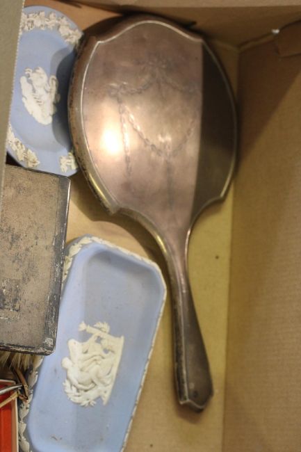 Art nouveau silver brush & white metal mirror, 2 pieces of Wedgwood & ladies wristwatch