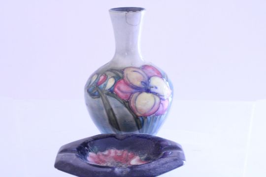 2 Moorcroft pottery pieces comprising a tube-lined vase with stylised floral decoration on a shaded ground, and a faceted ashtray with conforming floral motif, each with impressed marks beneath.