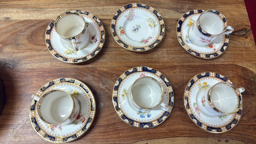 Group of porcelain floral teacups and saucers with gilt and cobalt borders