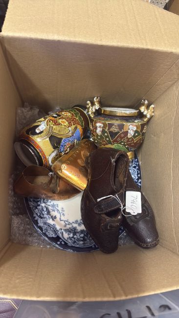 Assorted Satsuma-style ceramics, blue-and-white plate, copper tankard and leather shoes