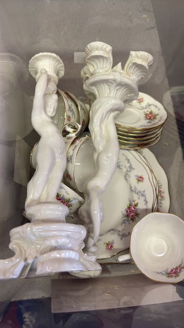 A group of decorative ceramics including a floral tea set and figural candlesticks
