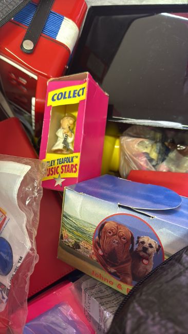 A group of assorted toys and small collectibles in a carry bag