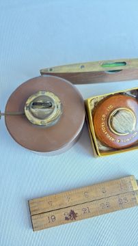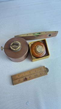 Group of Vintage Measuring Tools Including Spirit Level and Tape Measures