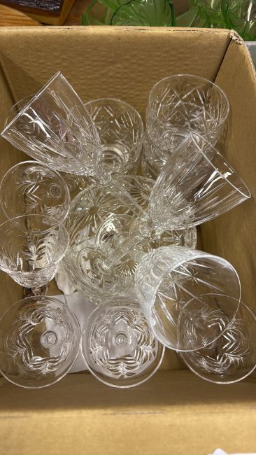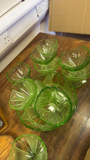 Group of cut glass drinking glasses and green pressed-glass dessert set