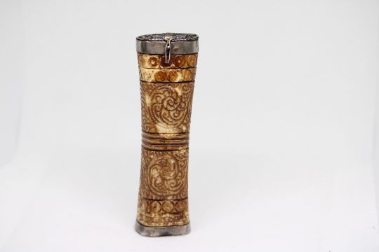 Antique carved container possibly bone with white metal lid & base Height 11 cm