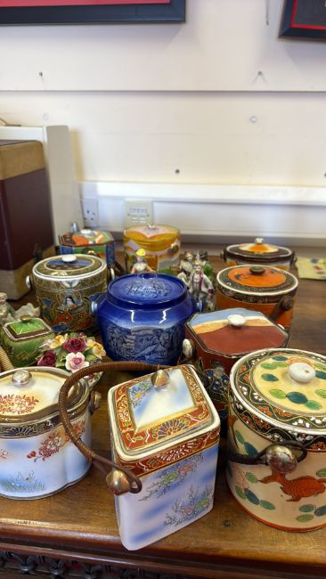 Group of assorted Japanese-style ceramic biscuit barrels, lidded jars and small porcelain figurines