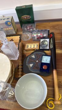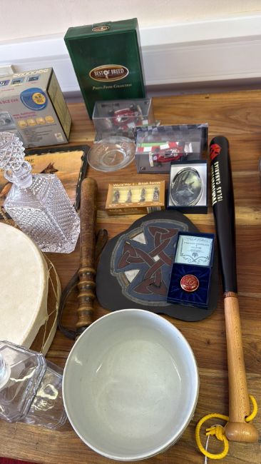 Group of mixed household and collectable items including cut-glass decanters and drum