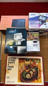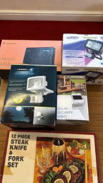 A group of boxed household electricals and a steak knife and fork set