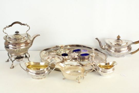 Group of silver-plated tea wares and oval gallery tray with cobalt-blue glass liners