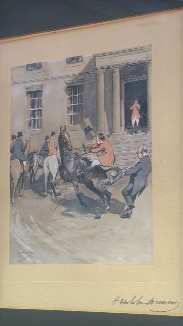 Framed equestrian hunting scene print, signed in plate (53cm x 44cm inc frame)