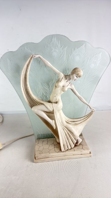 Art Deco style figural table lamp with etched peacock-feather glass screen