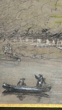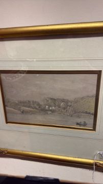 19th Century School: River Landscape with Figures, graphite and watercolour (36cm x 43cm including frame)