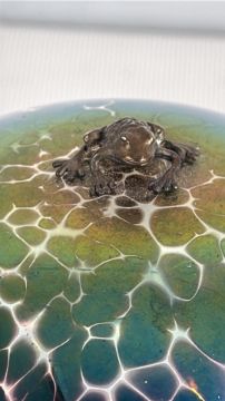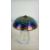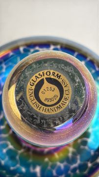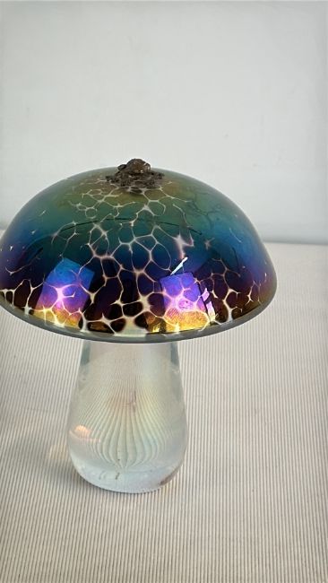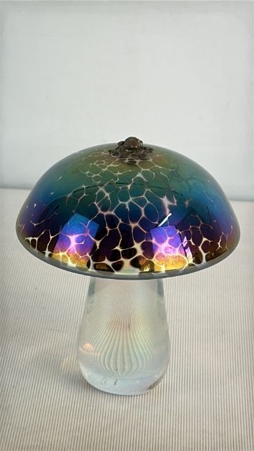 John Ditchfield iridescent crackle glass mushroom English labelled underside with silver frog