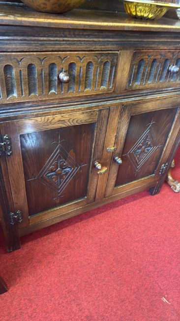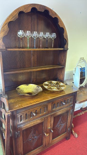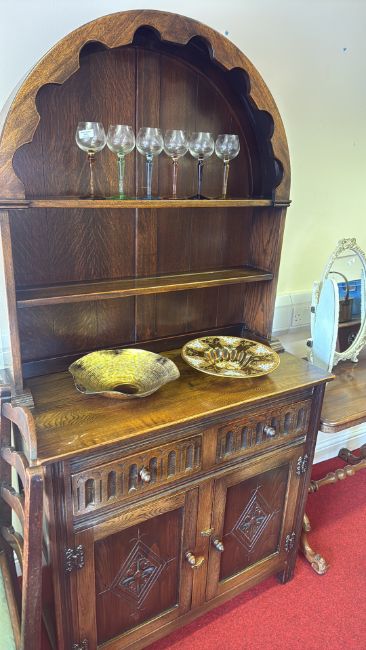 Arts and Crafts oak dresser with arched scalloped rack