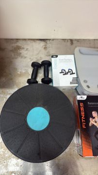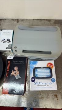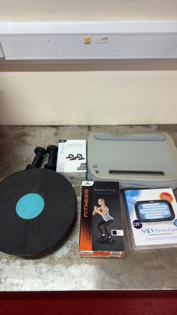 Group of fitness accessories, including Core balance board, Crane balance pods and push-up bars, SAD therapy light, and foot spa unit