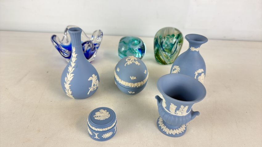 Blue Jasperware and Art Glass Assortment